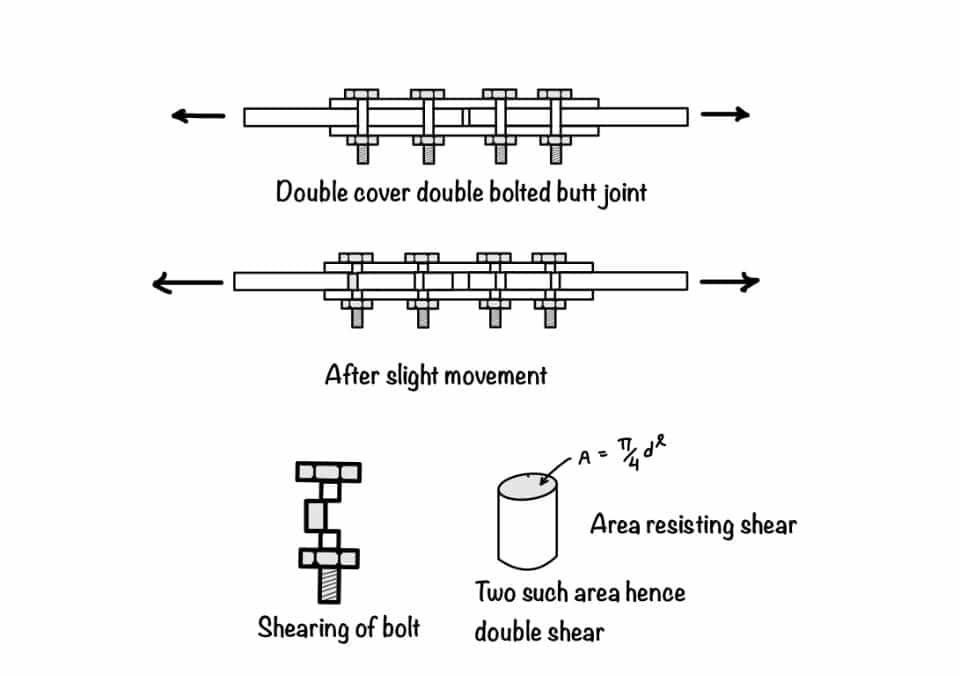 Shearing Failure: This type of failure occurs when two plates try to shear off the bolts. We will consider the cross-sectional area of the bolt to calculate the shear strength of the bolt.