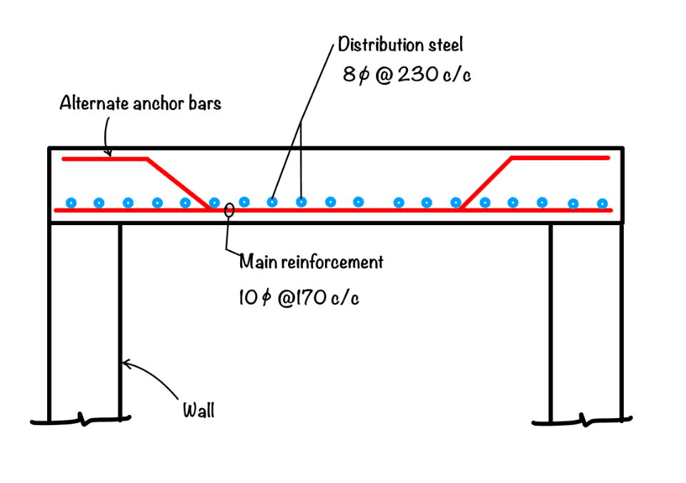 After calculating the effective span of the slab and the factored load of the slab we calculate the design moment. The design moment in the slab is . The detailed calculations and verification 0f results we can do from the earlier article.