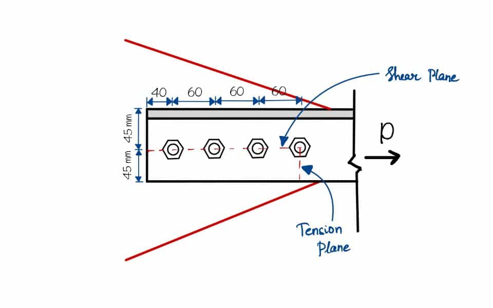 Design Example: Design a 2.5 m long single section angle acting as a tension member in a bridge truss. The member is subjected to a factored load of 280 kN. Assume the gusset plate thickness as 16 mm and the diameter of bolts to be used as 20 mm of grade 8.8. Assume Fe 410 grade of steel.