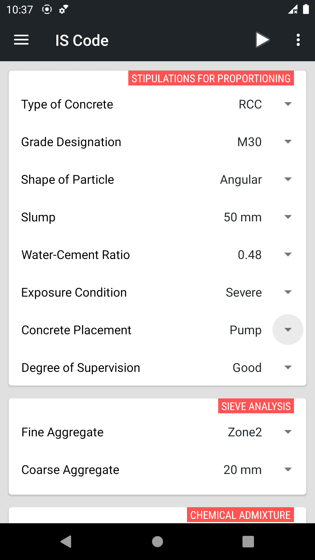 Step 1: Download the application from play store and install it. Once you are done with the installation, open the application and select the first option "Design mix" -to design a concrete mix as per IS 10262:2009.