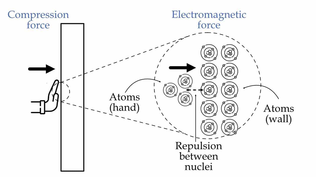 For example, you are pushing your hands against the wall. In general, we say you are applying a contact (compressive) force on the wall. But, when you zoom in on a small portion where there is contact between the wall and the hand. Then, you can notice that what exactly is happening is that the atoms (nuclei) in your hands are pushing against the atoms (nuclei) in the wall since the nuclei are positively charged, therefore. As a result, there is electric repulsion between the nuclei, as shown in the figure below. So, it is a contact compressive force in the bigger picture, but in the small picture, it is just an electromagnetic force (electric and magnetic). And it is funny to say there is contact force because technically, atoms in your hands aren’t touching atoms in the wall.