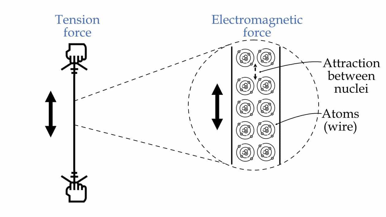 Similarly, when you are pulling any wire with your hands. Then on the macroscopic level, you can say that you are applying tensile force on the wire. But when you zoom in to the microscope level, you can see that what exactly is happening is you are trying to pull atoms (or molecules) away from each other. As a result, there is a force of pull between the atoms to bring them down to their original position, as shown in the figure below. So, at the macroscopic level, it may look like a tensile force, but actually, it is just an electromagnetic force (pull).