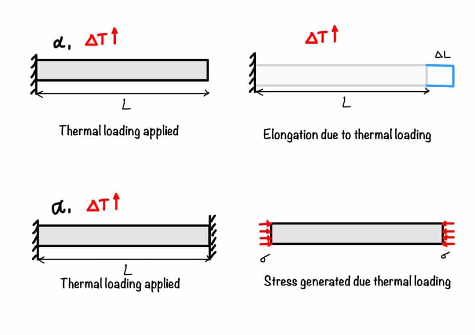Thermal stress occurs when thermal loading induces stress in a structure. When temperature changes affect structures, they naturally undergo a change in length. You can calculate this change in length using the formula: