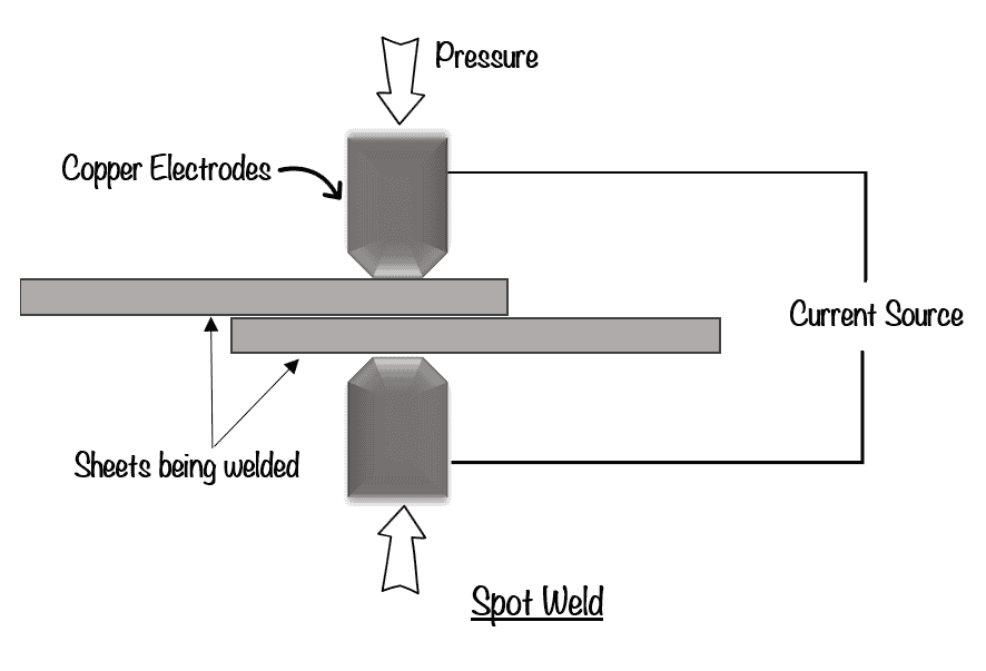 Spot welding is a type of weld used to join two or more pieces of metal by applying pressure and passing an electric current through them. Use of this type of weld is common in the automotive industry to join sheet metal components.