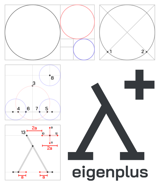 The eigenplus logomark is built on a geometric framework inspired by proportional harmony. Circles and lines are used to define consistent relationships between angles, lengths, and spacing.