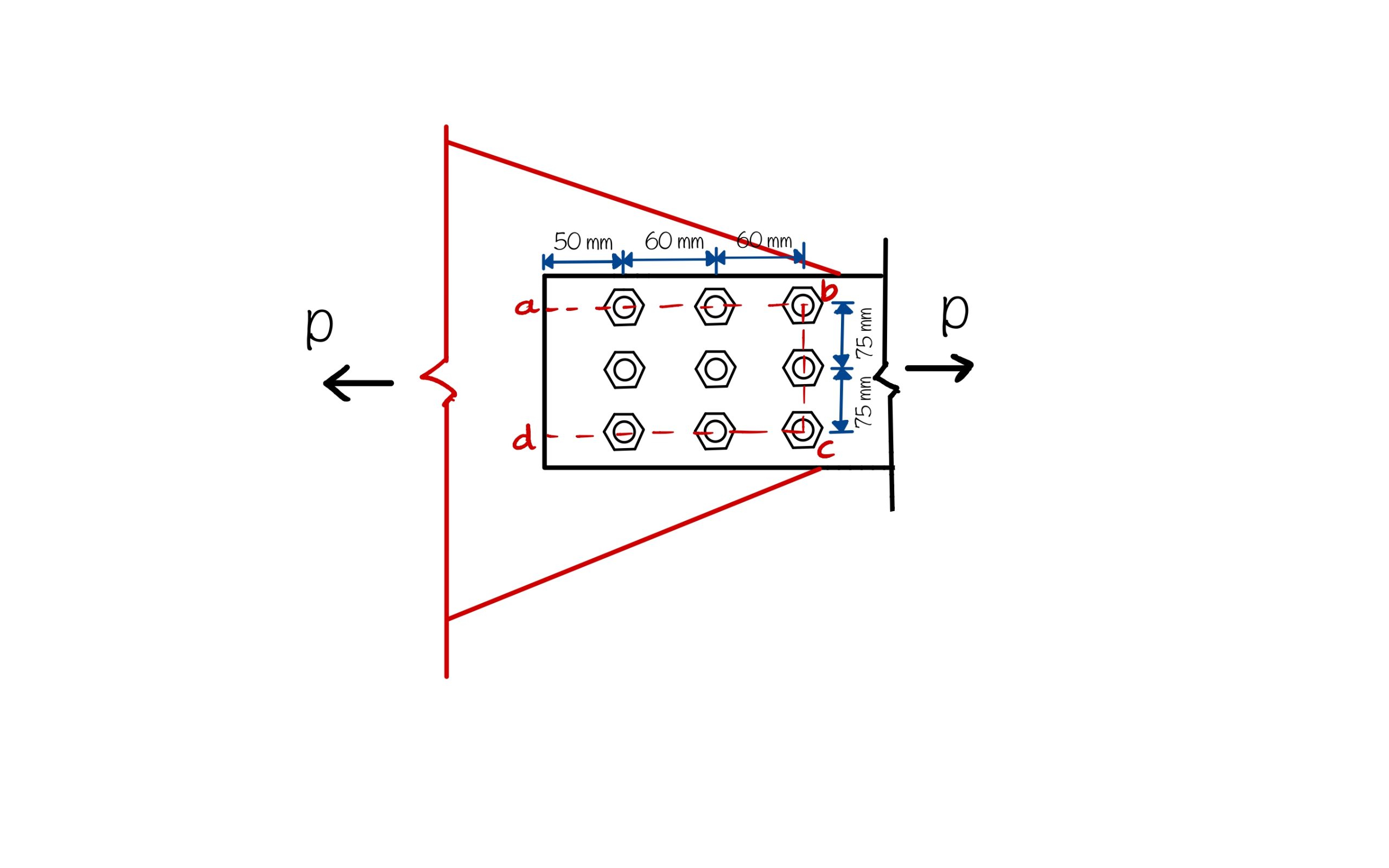 A flat plate, 300 ISF 8 mm of grade 410 is connected to a 12 mm thick gusset plate by 18 mm diameter bolts of grade 4.6. Calculate the design tensile strength of the member. The bolting pattern is shown below.
