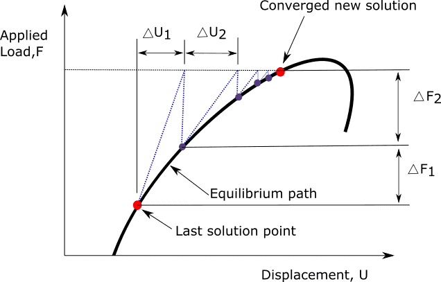We can develop a basic understanding of the Newton-Raphson method from the below figure. It shows the iterations in the case of a load-deflection study. The load is increased in predefined increments. Displacement is calculated on the basis of the previous step's stiffness. Then we correct this displacement based on the difference between internal force and external force. We run the iteration until we get convergence.