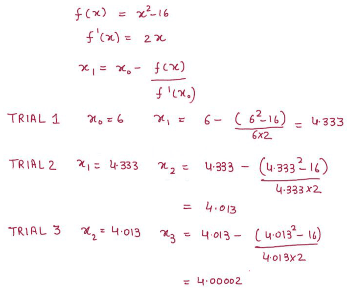 We can apply the above-discussed formulation to solve a very easy numerical problem. Suppose you need to find the square root of 16 and being very poor in mathematics; your friend will give you three chances to come to the right solution. Will you win this bet? Let's figure out using Newton Raphson Method.