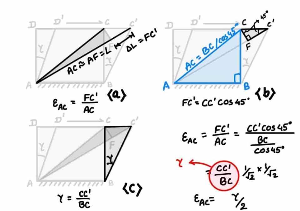 Strain in the diagonal (AC) is shown in part (a), this strain is related with (CC') in part (b), shear strain computation is there in part (c), finally the strain in diagonal (AC) is related with the shear strain in the cuboid.