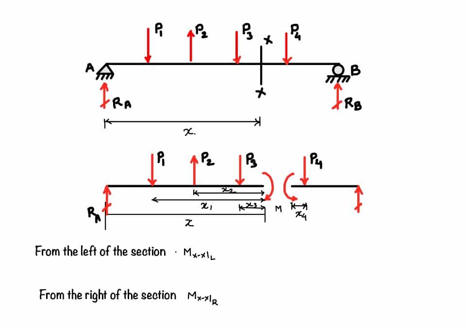It is the summation of all the vertical forces, either left or right, of the section. You can see there is the number of forces in the beam in the figure. Suppose you want to find out the shear force at section . So the shear force at section is the summation of , or from the other side, it is the summation of .