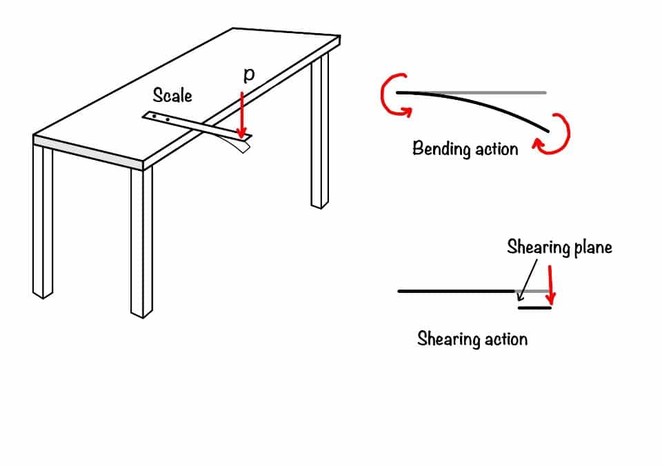 When you apply the load in the scale, as shown in the figure, you are applying a transverse load in the scale. These transverse load in the scale causes the bending and shearing effect, as shown in the figure. The force responsible for bending the scale is called the bending moment, and the force responsible for shearing the scale is called the shear force.