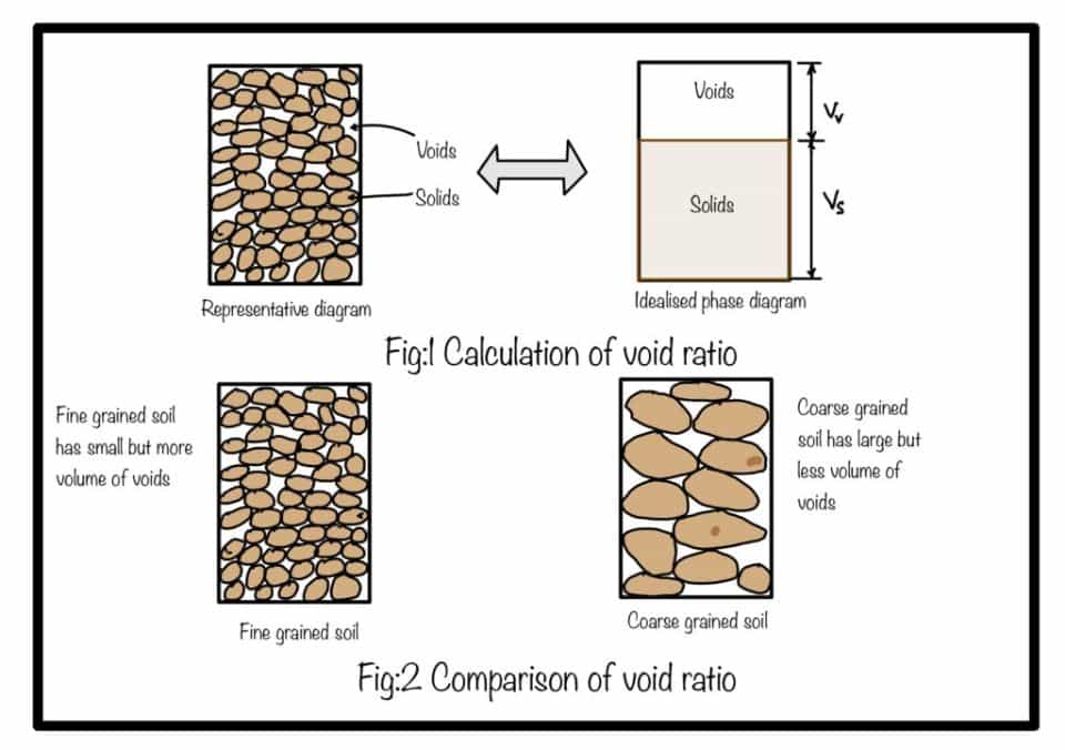 Void ratio: It is the ratio of volume of void to volume of solids. Very important parameter to derive different soil properties.