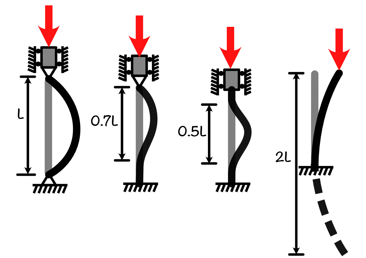The effective length of a column can be different from its actual length, on the basis of the type of support and the loading conditions. Euler's column formula is for pin end column hence load carrying capacity changes with change in support condition. Incorporate this change in support condition by the effective length as shown in below figure.